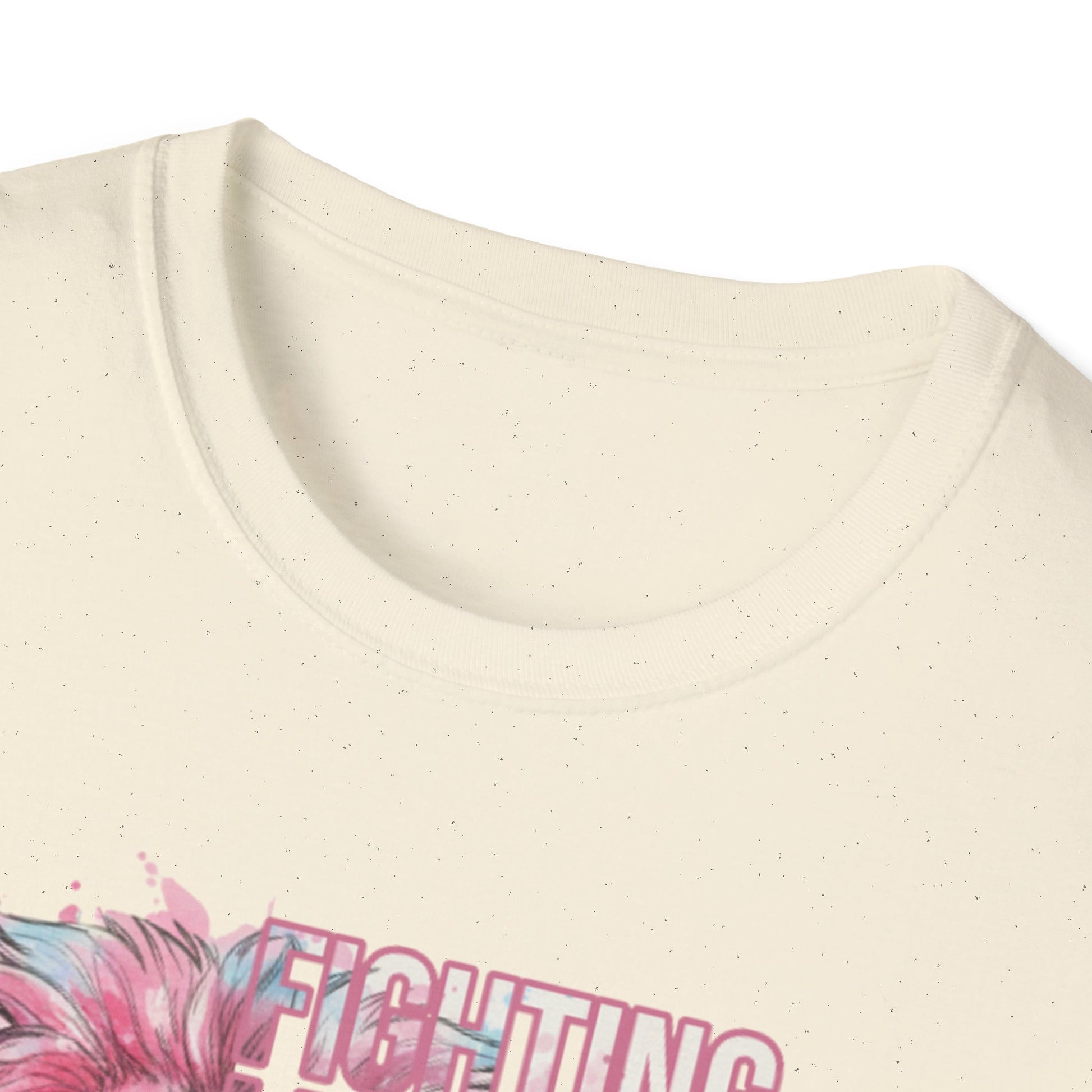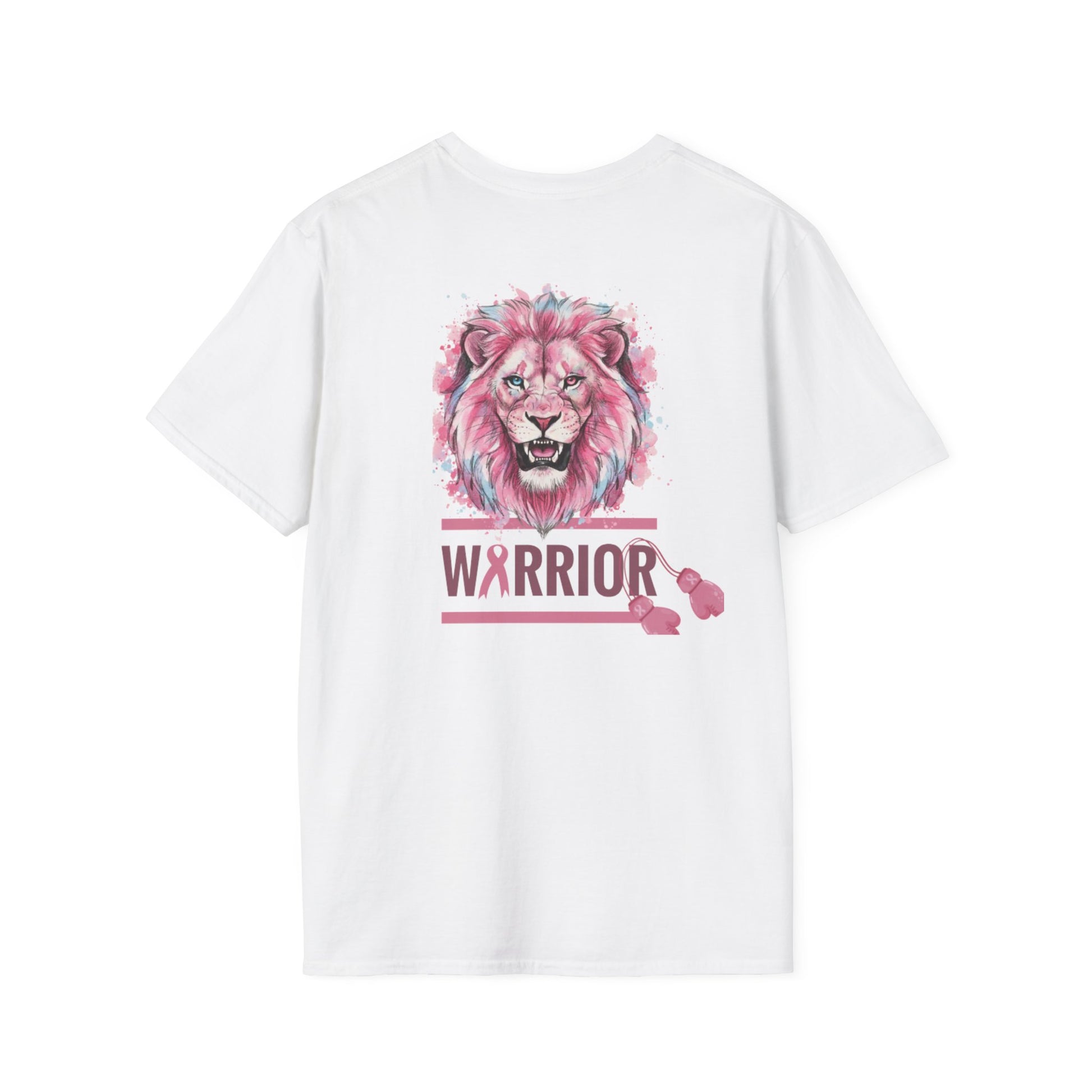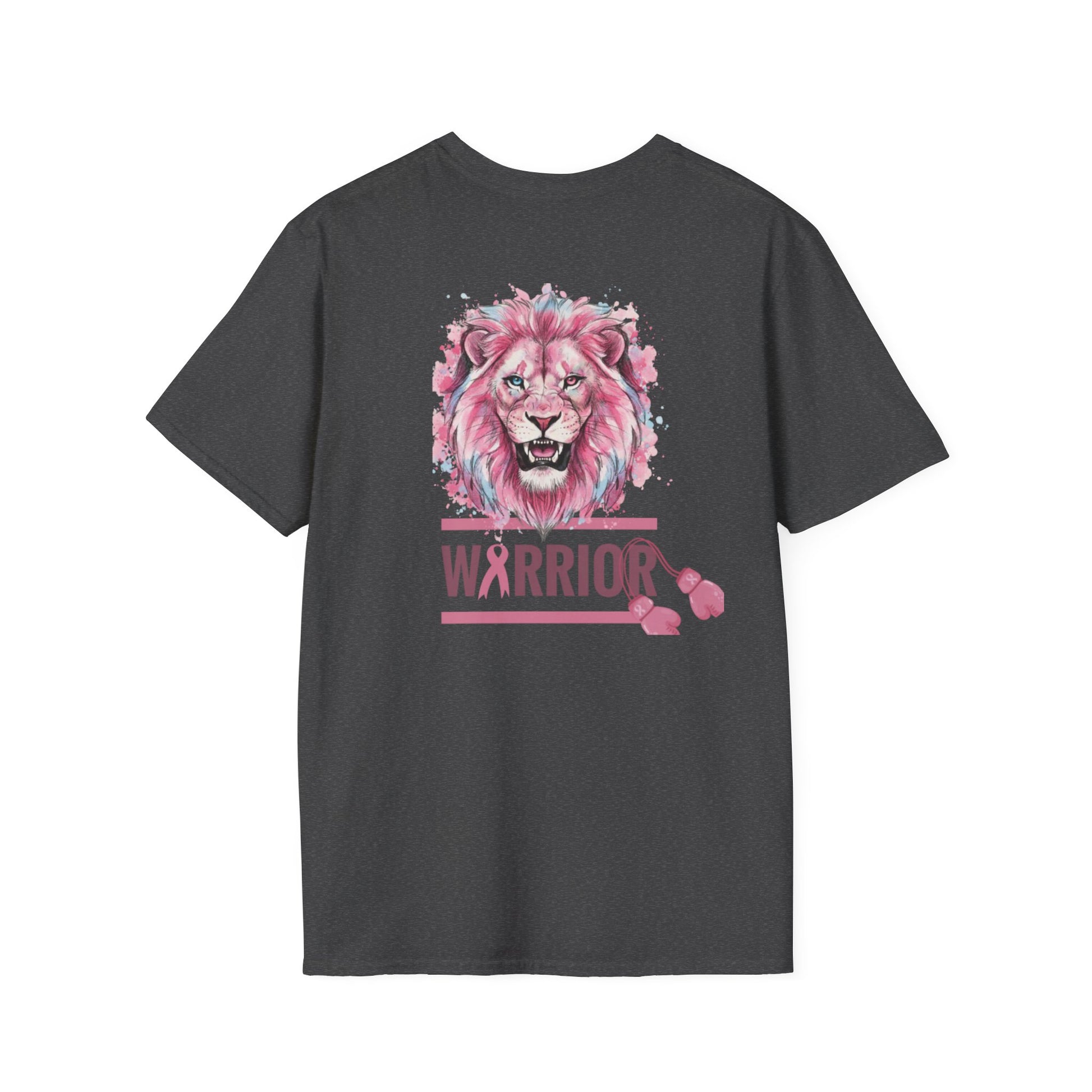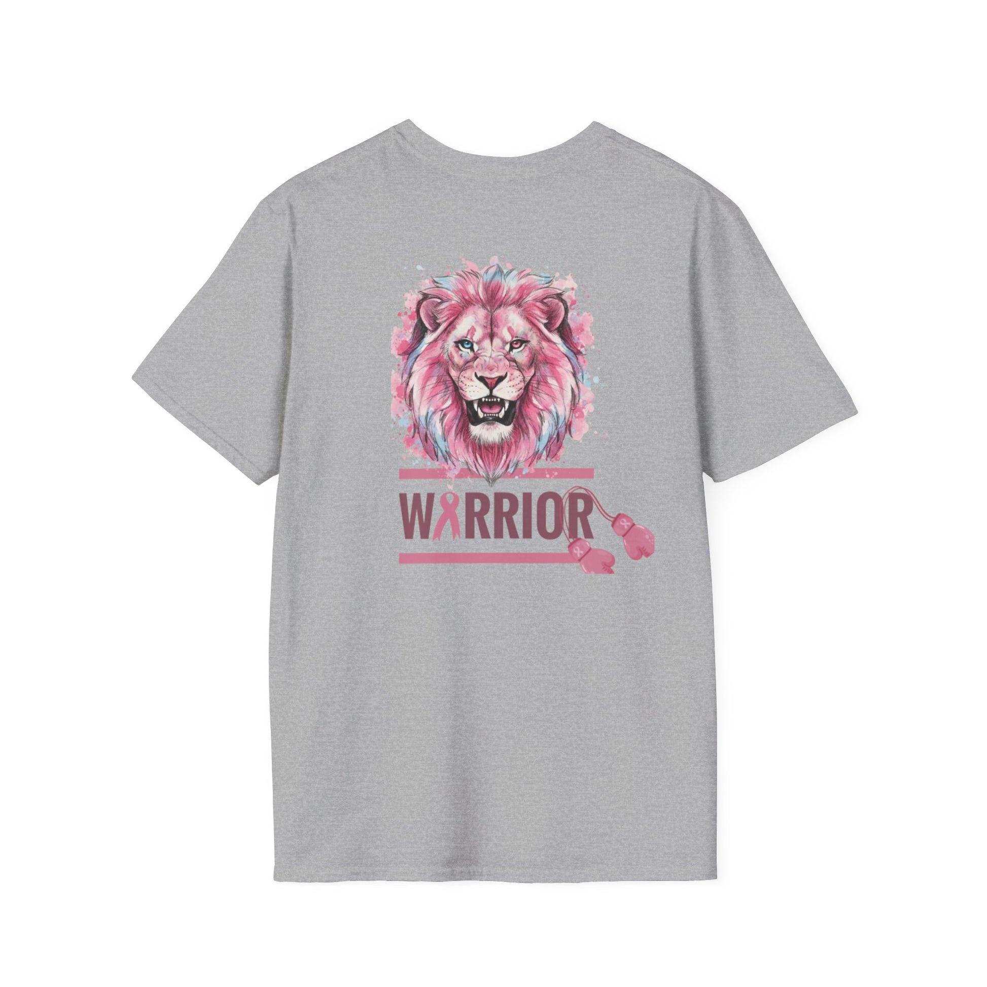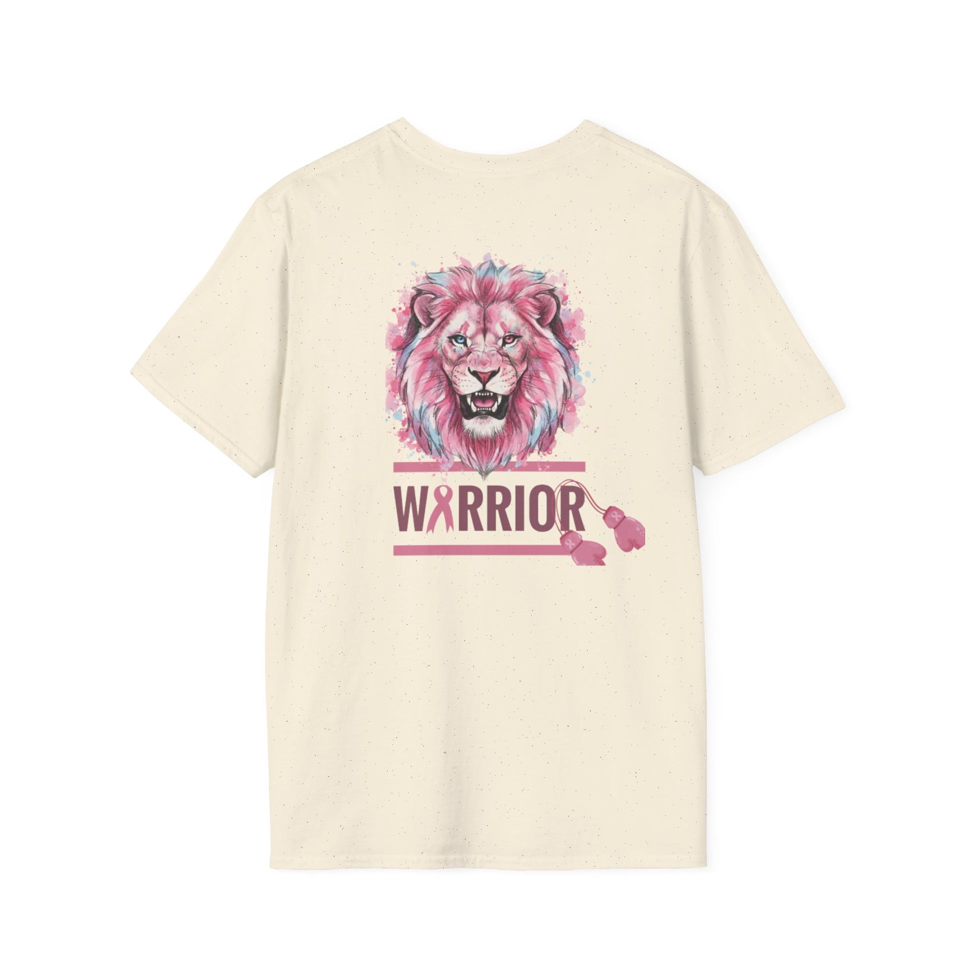 This lightweight crewneck tee carries quiet strength — a soft, breathable cotton canvas printed with a watercolor-style pink lion and breast cancer awareness accents. The front pairs a fiercel y gentle lion portrait with an encouraging, faith-forward phrase and a subtle awareness ribbon. The back features the lion again above a bold “WARRIOR” bar, finished with small ribbon motifs. Wear it to show solidarity, to honor a survivor, or to bring gentle courage to everyday moments. The fabric drapes easily, holds printed detail well, and keeps you comfortable from casual days to fundraising walks.